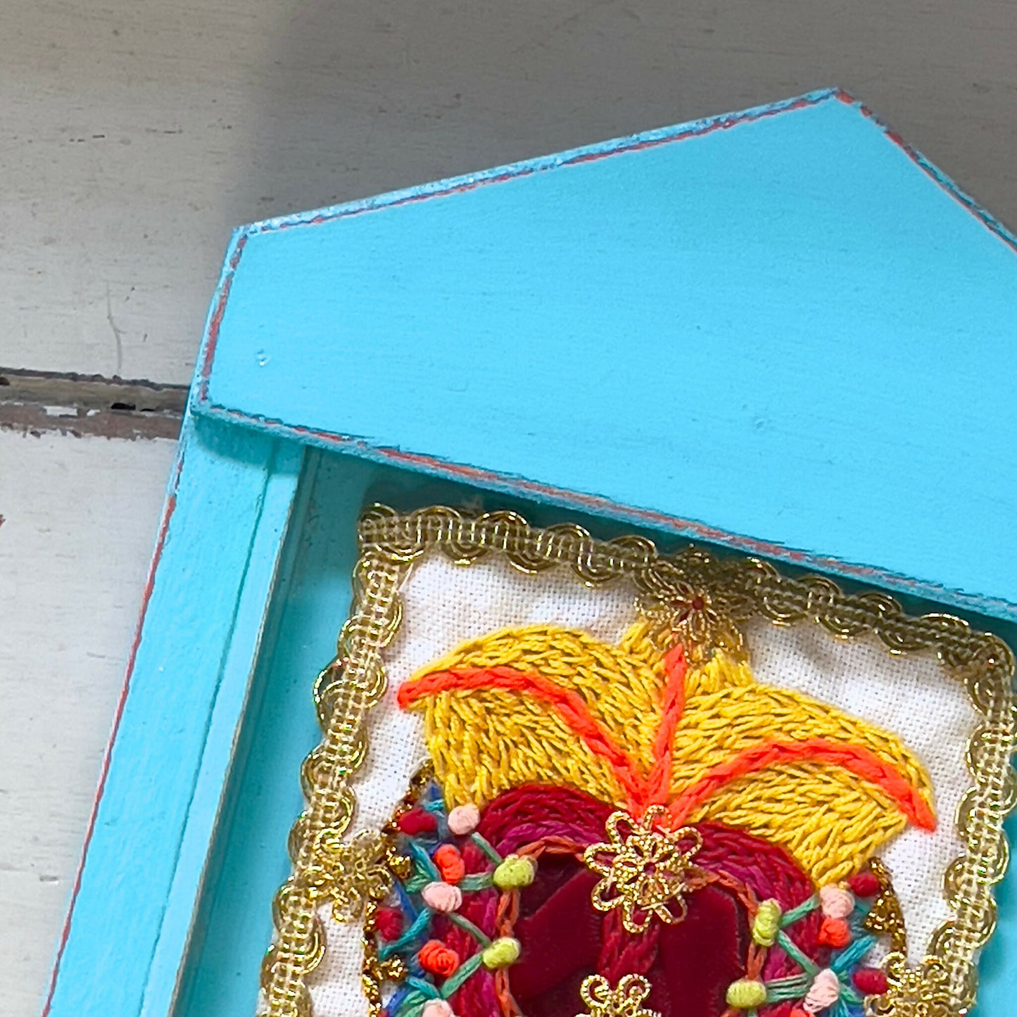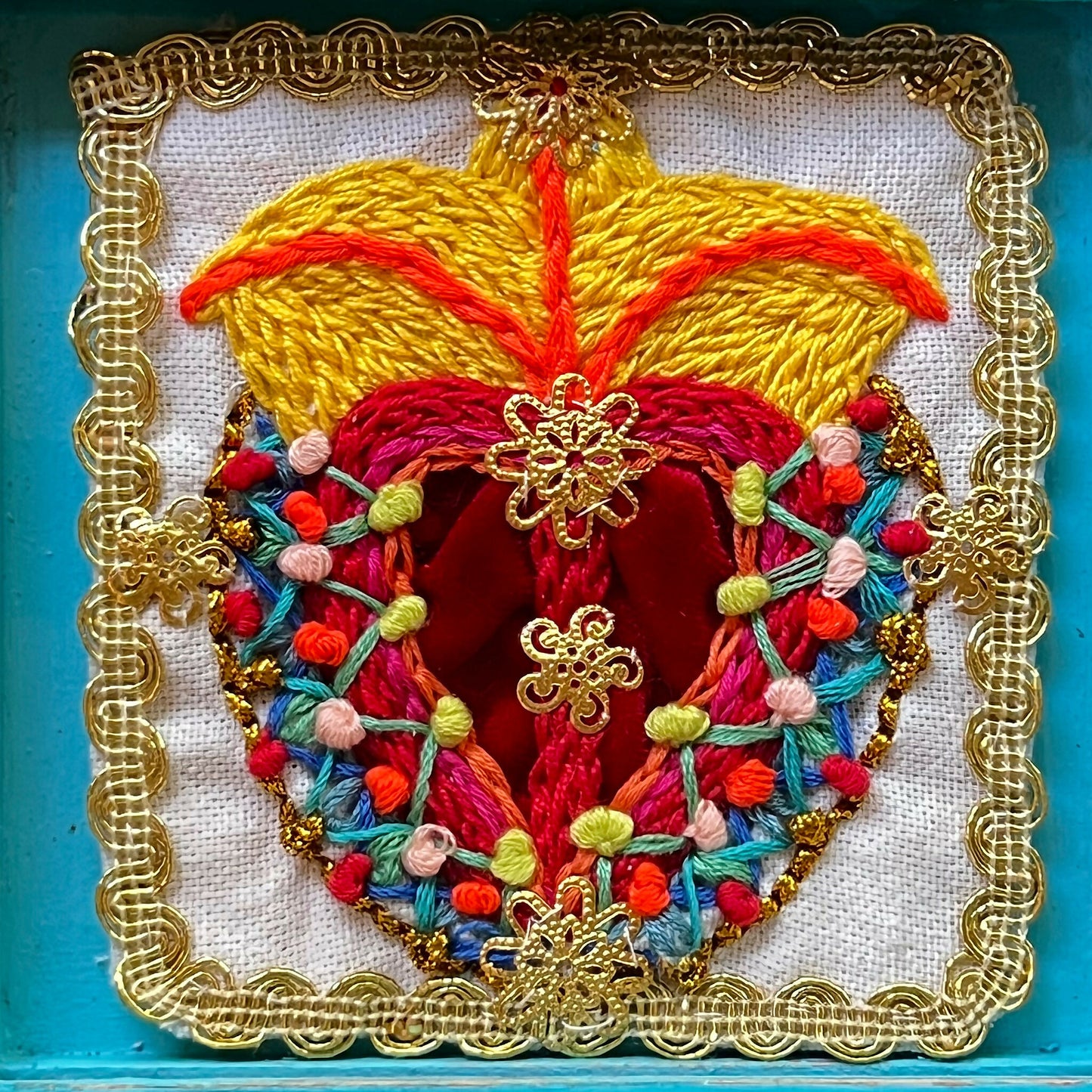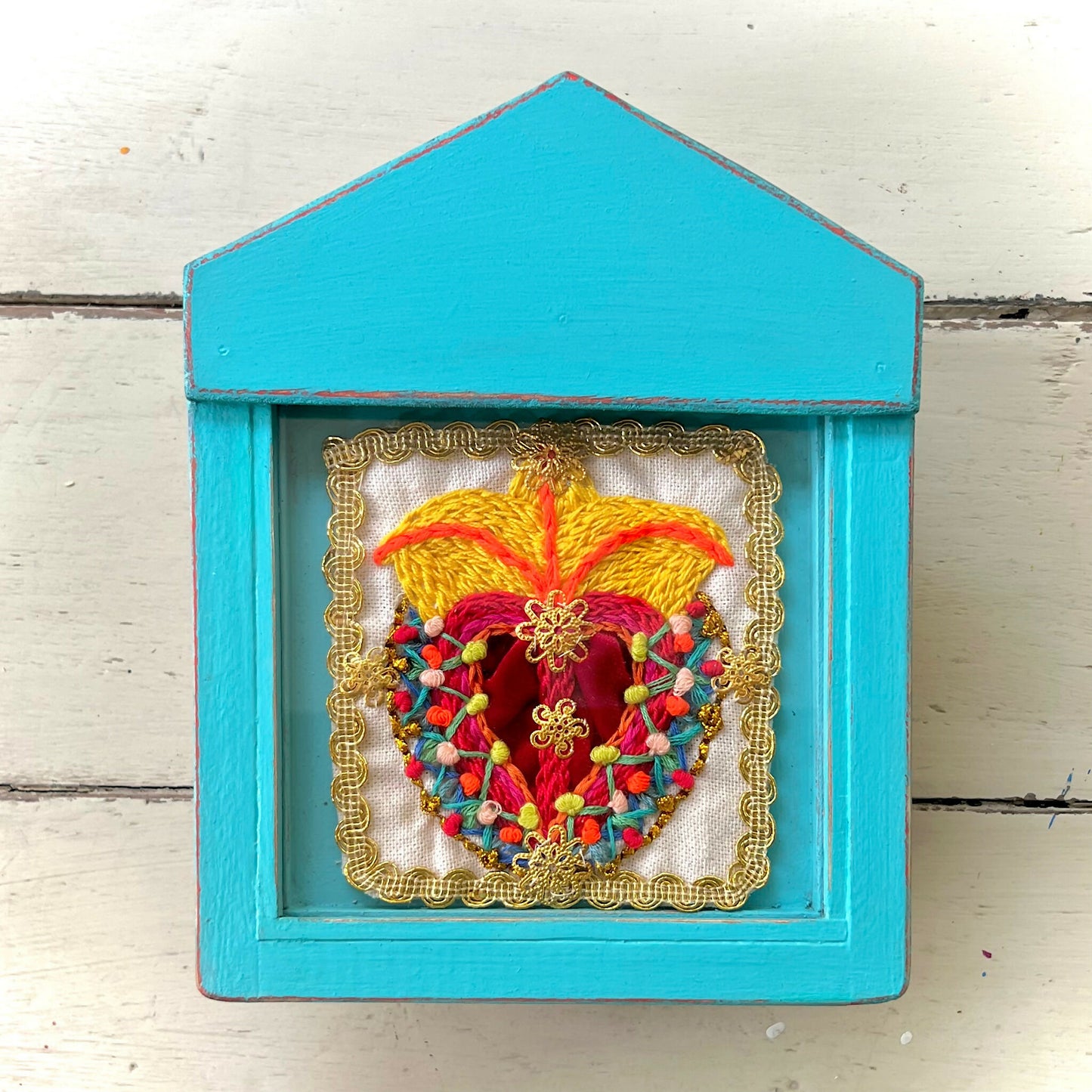 Manufactured completely by hand, from the carpentry of the altarpiece to the embroidery inside, it is for this reason that each piece is unique and never identical to another.In a slow production process and full of details, which is why its production is exclusively in very limited quantities. The Chilean artist and artisan Rocío Inostroza, creator of these altarpieces, rescues an ancient tradition full of beauty and meaning, where women embroidered a Heart of Jesus, as a protection amulet for their loved ones, a custom that belongs to the beliefs and popular arts of their country and their own family history.