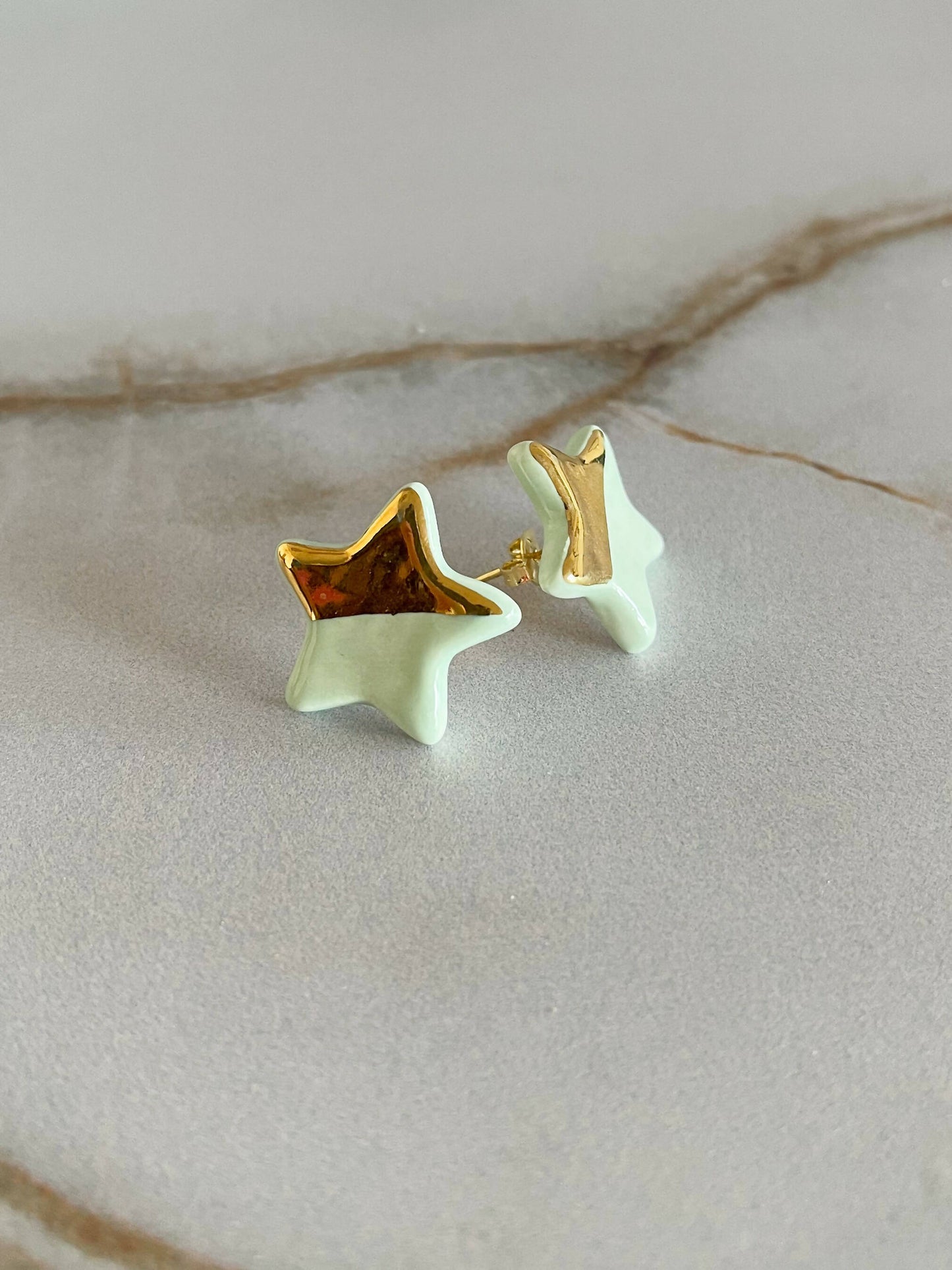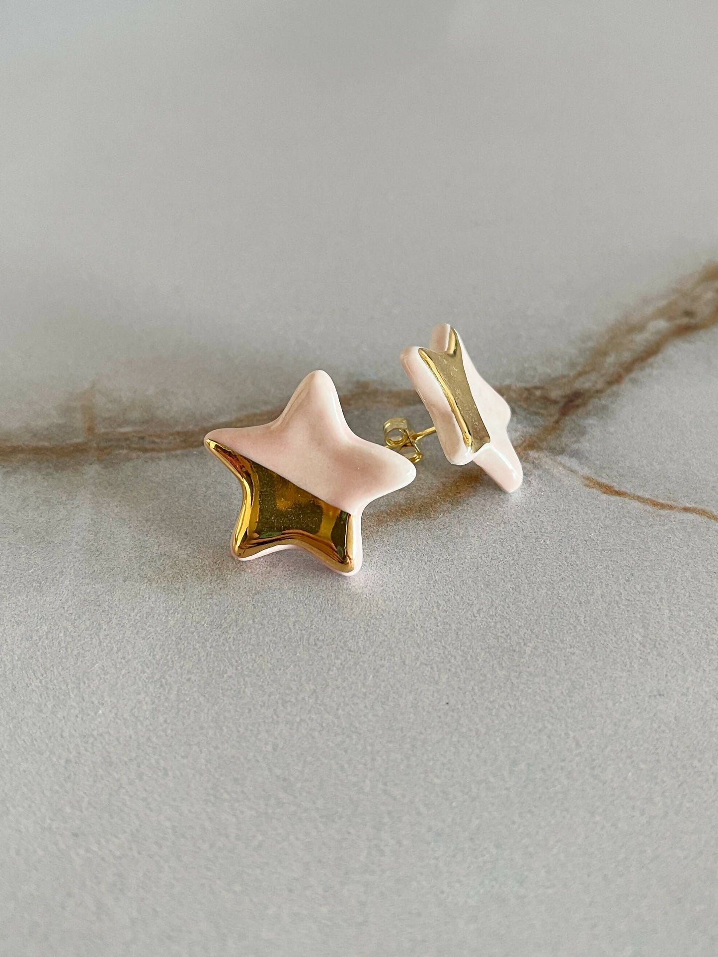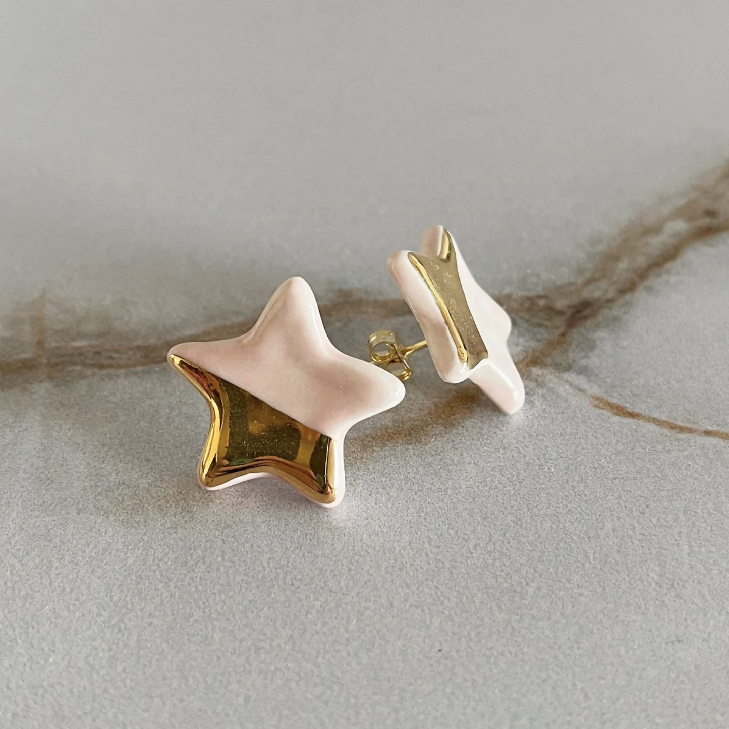 Made in Chile, with the modeling technique, these star earrings are ideal for any occasion. They are made with low-temperature ceramic and decorated with 24 kt gold luster.