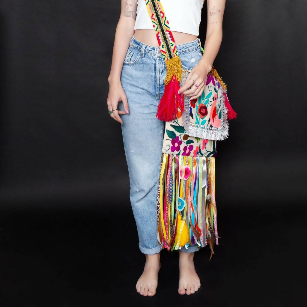 The funkiest statement piece of the funky familia. Its wide space will help carry all of your belongings in a cool-boho way. Each collection features different handmade telares from all over Mexico, always made by women. Includes an attached strap which cannot be adjusted or removed. Care: clean with a wet wipe