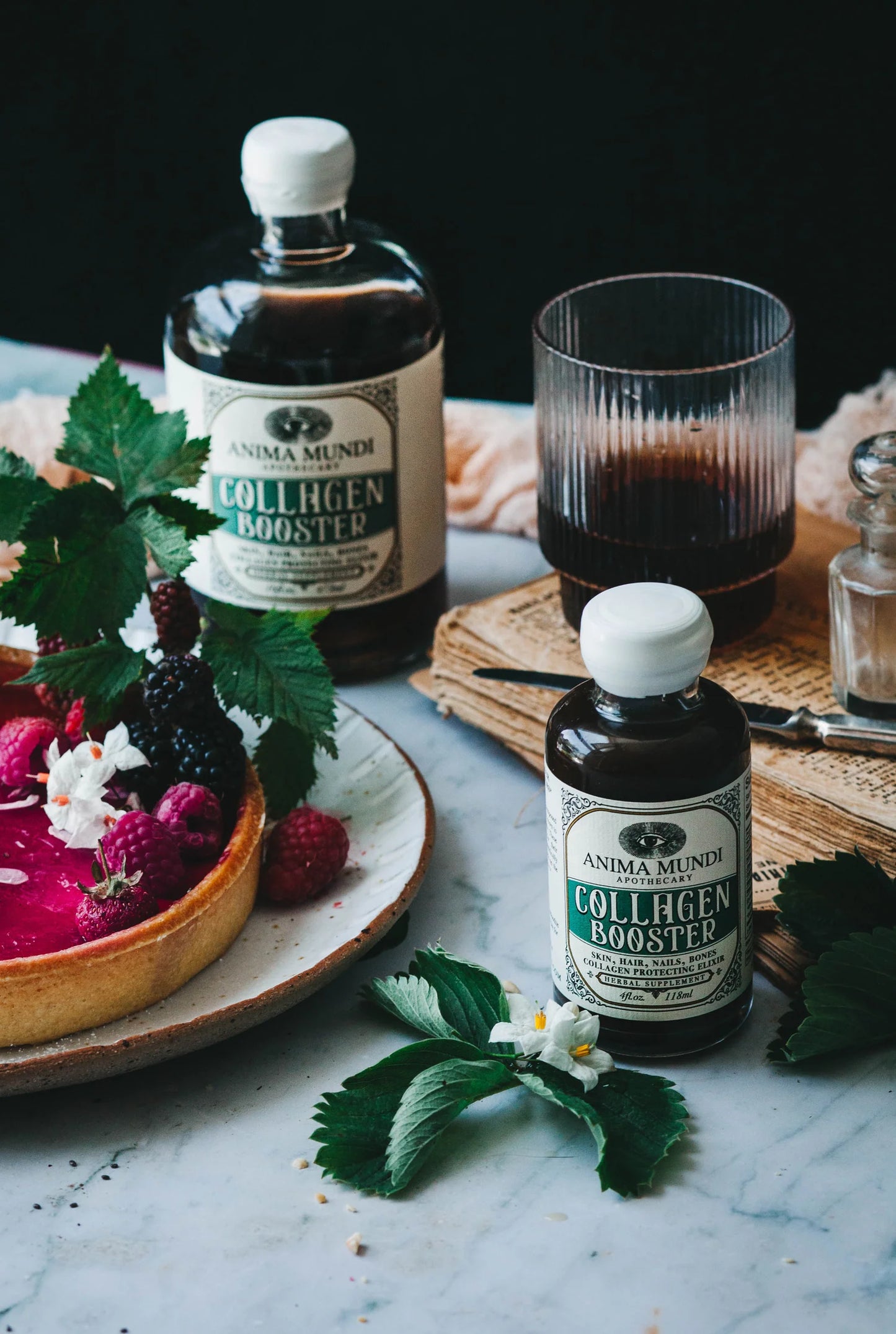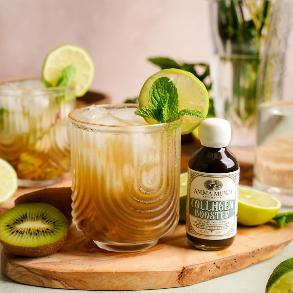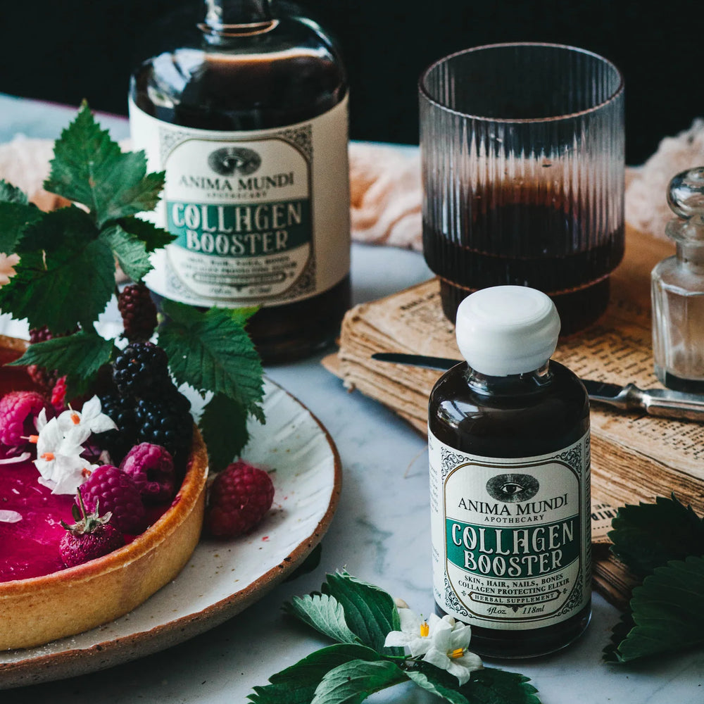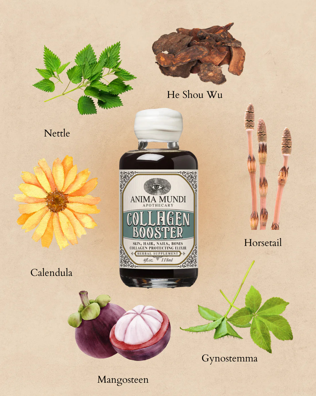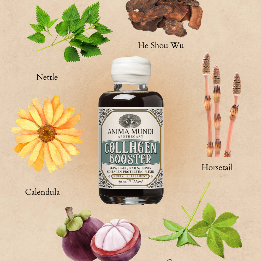 Collagen Booster is a potent, plant-based elixir featuring a synergy of adaptogens and mineral-rich herbs traditionally used to support the body’s natural collagen pathways.* This revitalizing blend is crafted to nourish the skin, hair, nails, bones, and joints—helping to promote a healthy glow from within.*