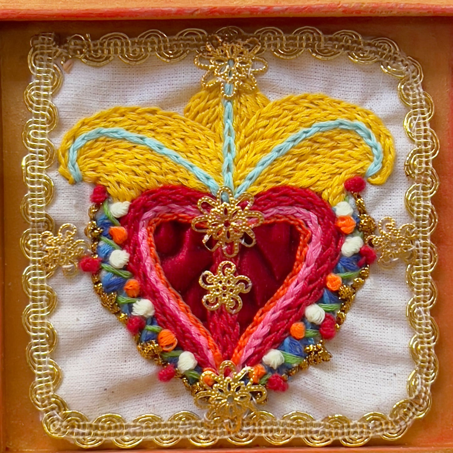 Manufactured completely by hand, from the carpentry of the altarpiece to the embroidery inside, it is for this reason that each piece is unique and never identical to another.In a slow production process and full of details, which is why its production is exclusively in very limited quantities. The Chilean artist and artisan Rocío Inostroza, creator of these altarpieces, rescues an ancient tradition full of beauty and meaning, where women embroidered a Heart of Jesus, as a protection amulet for their loved ones, a custom that belongs to the beliefs and popular arts of their country and their own family history.
