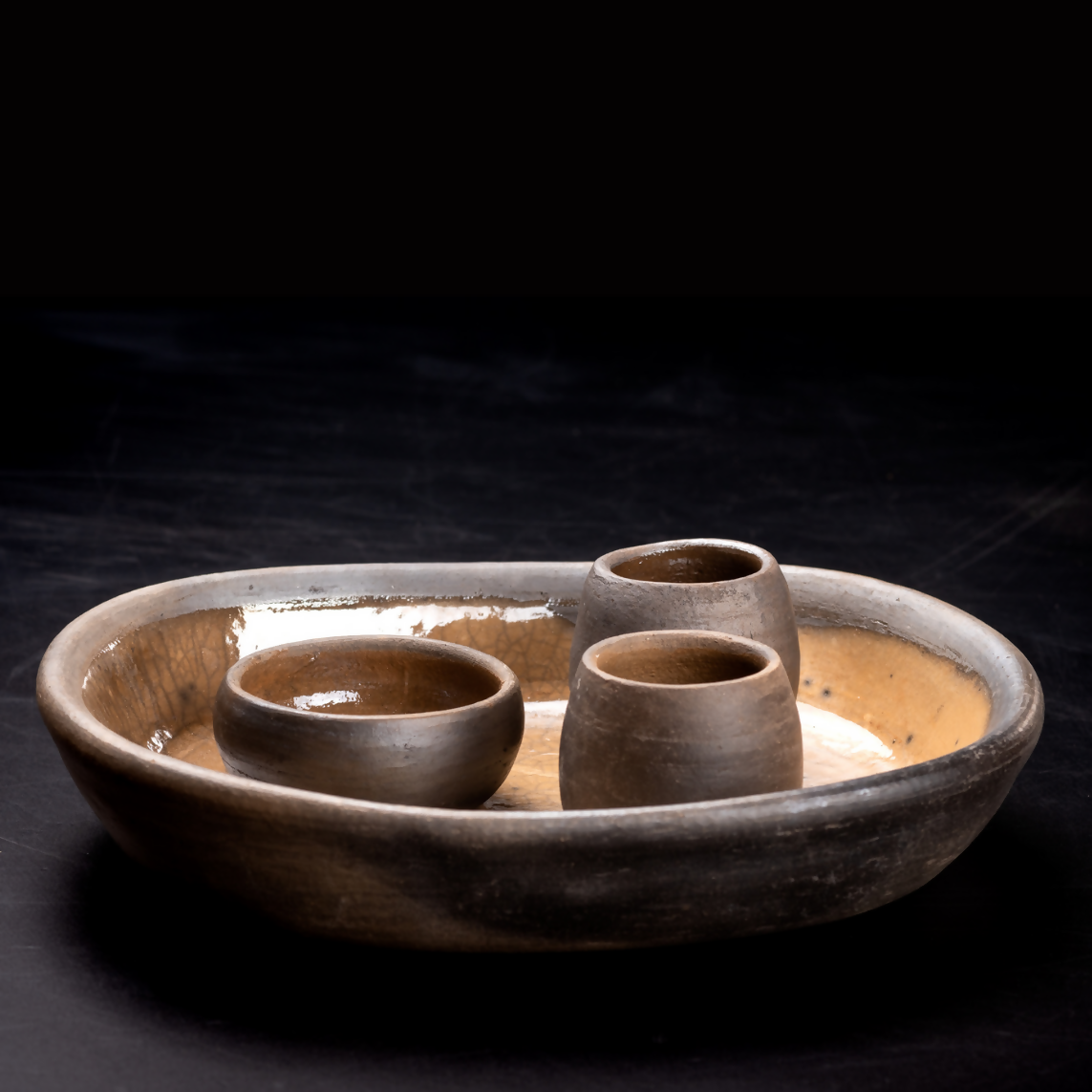 Set includes: Clay Serving Tray 17 cm x 22 cm (6.7” x 8.7”) Two “Barrilito” Cups 5 cm x 5 cm (2” x 2”) “Coquito” Cup 3 cm x 7 cm (1.2” x 2.8”)