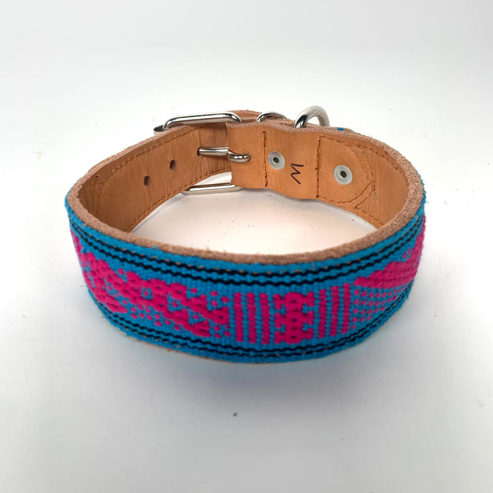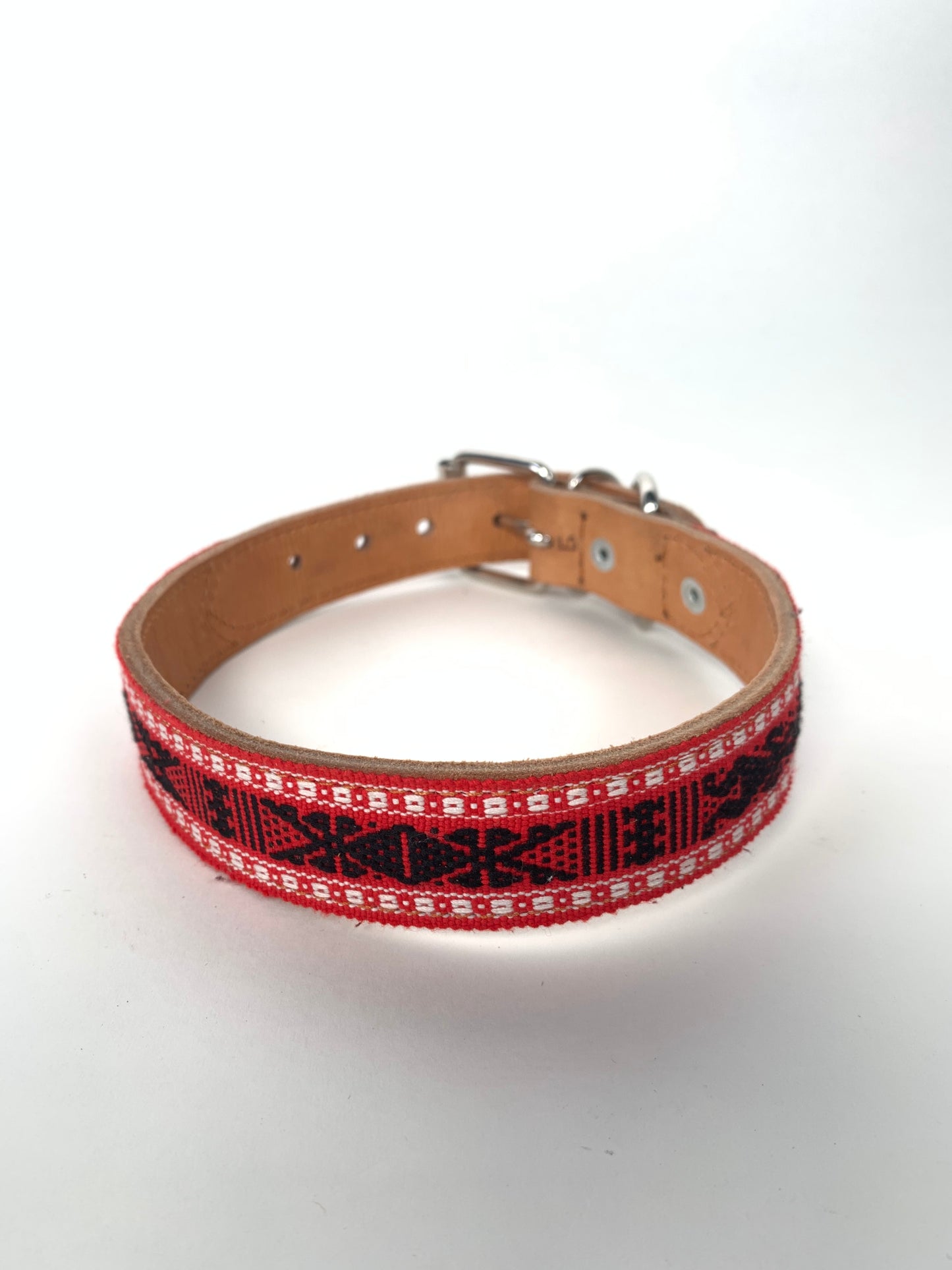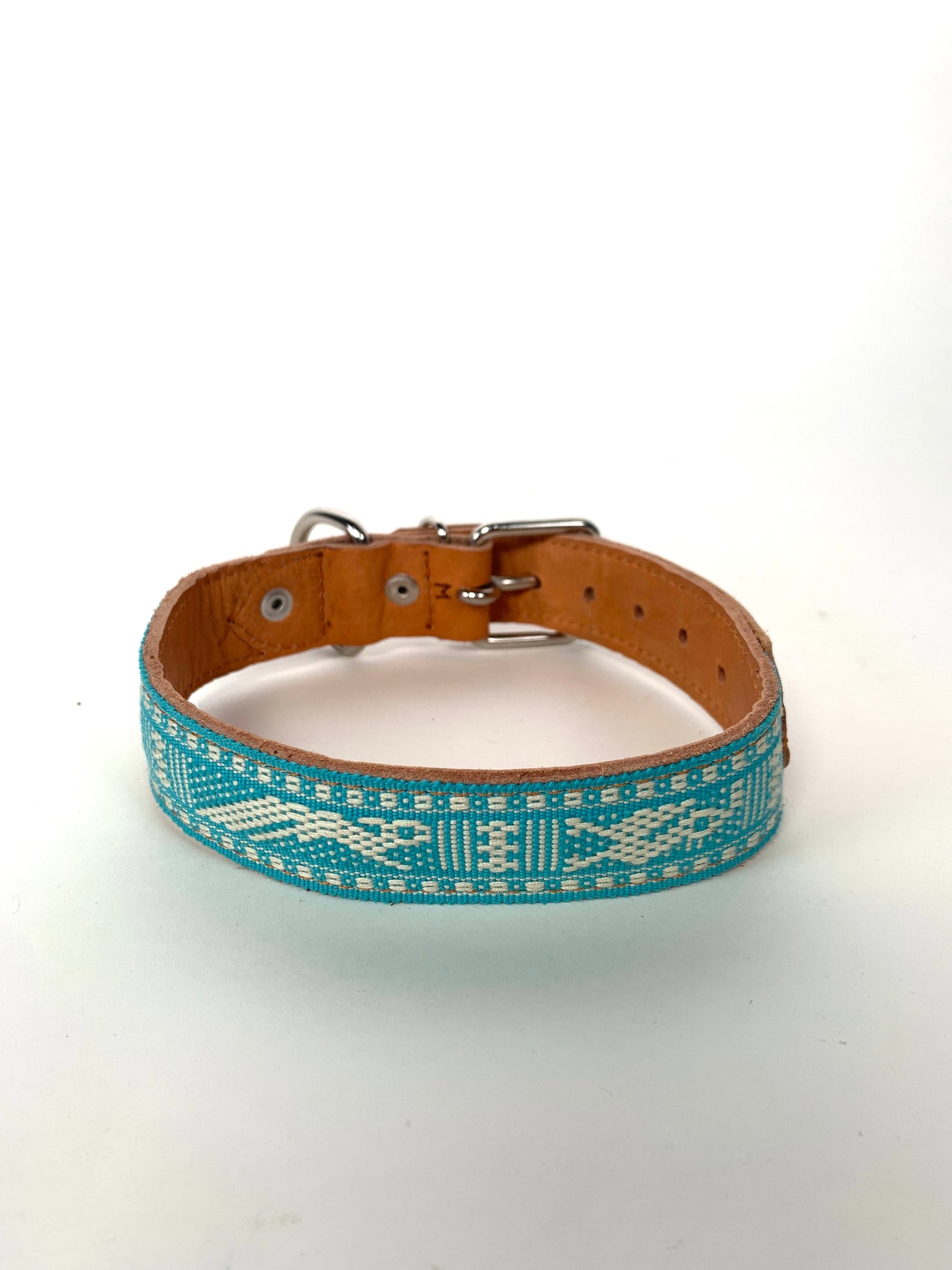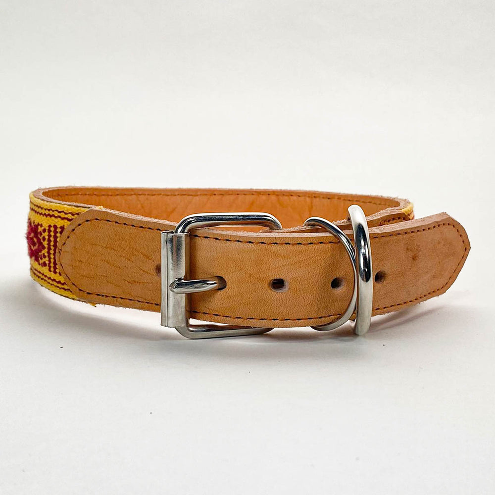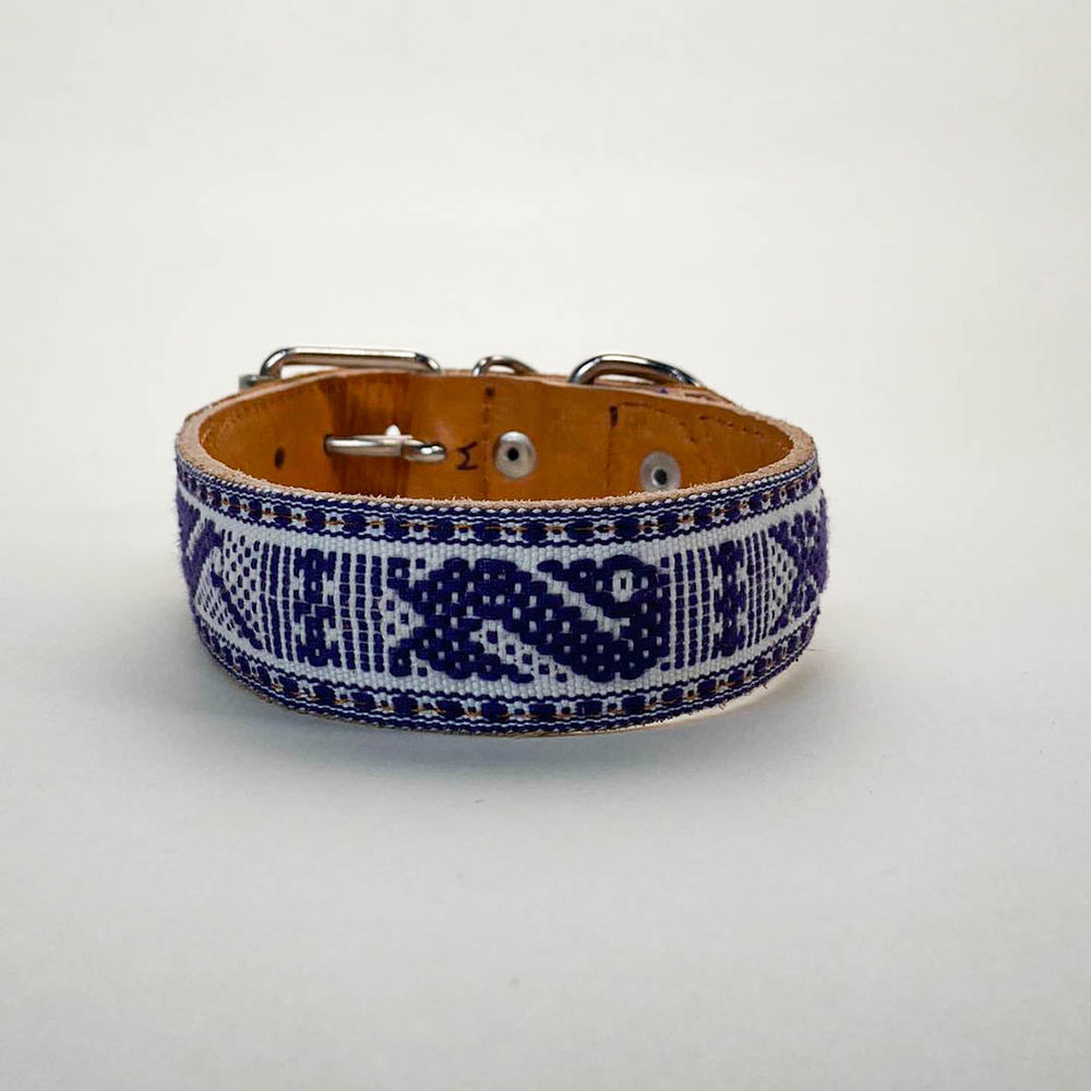 These dog collars and leashes by Ina Chiisi were created in the Valle de Oaxaca, this technique is known as "telar de cintura" and its primary is cotton, which is dyed by natural extracts from plants like nopal, flowers, aloe vera; insects like the grana cochinilla, and fruits like the banana leaf, that the artisans extract and elaborate.