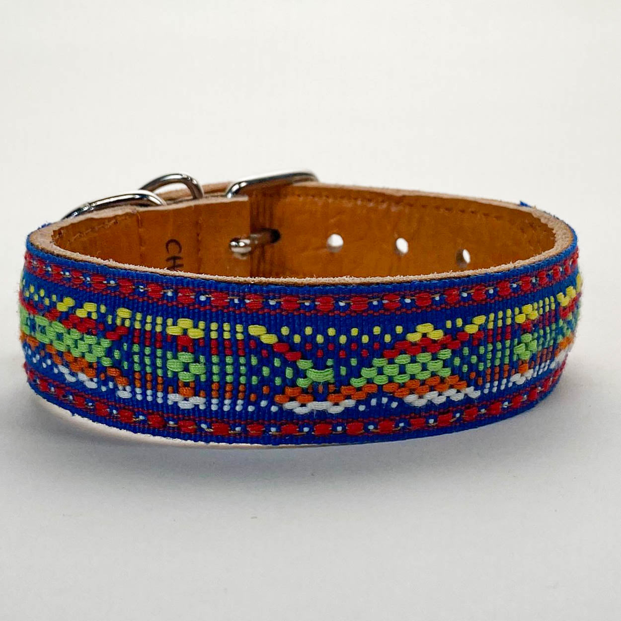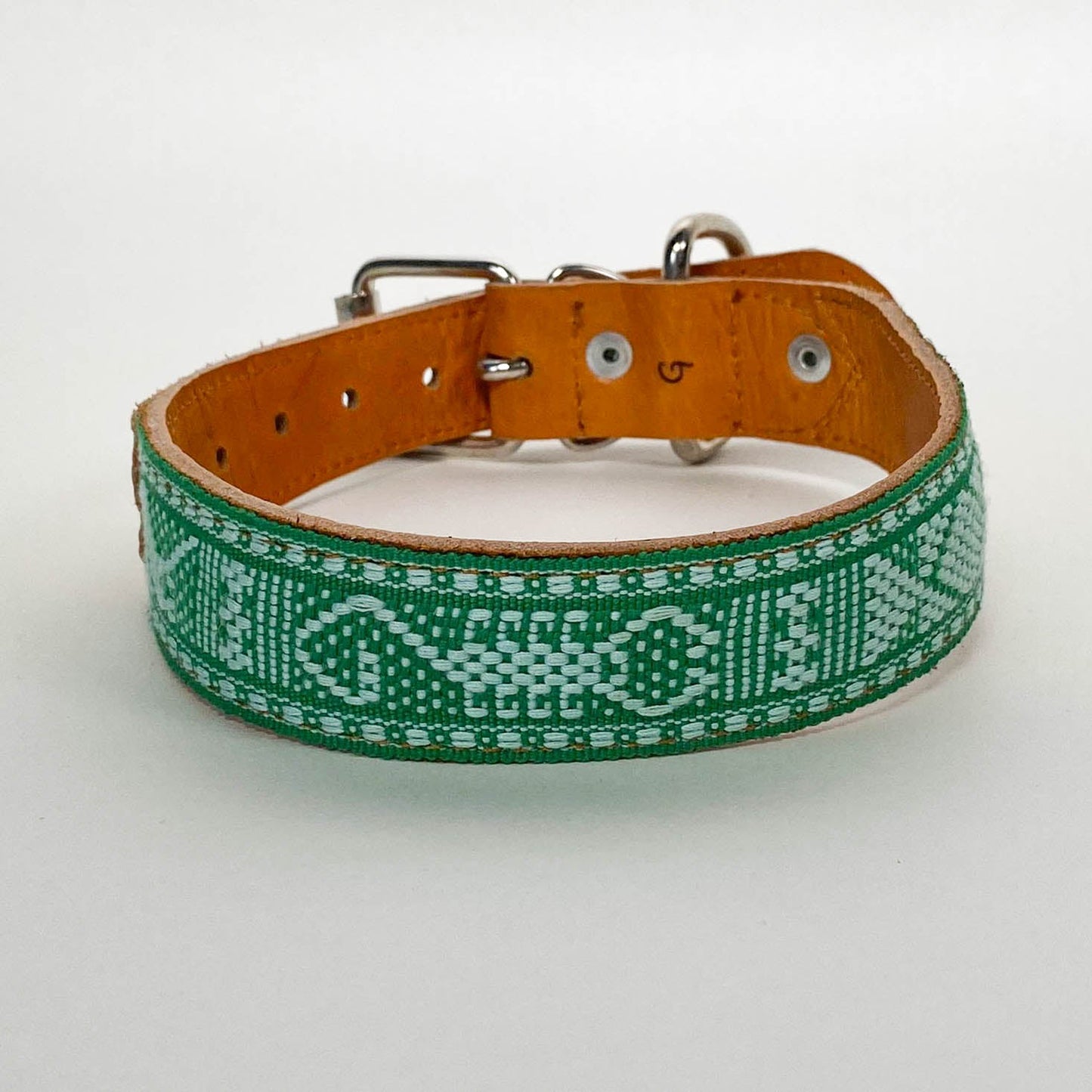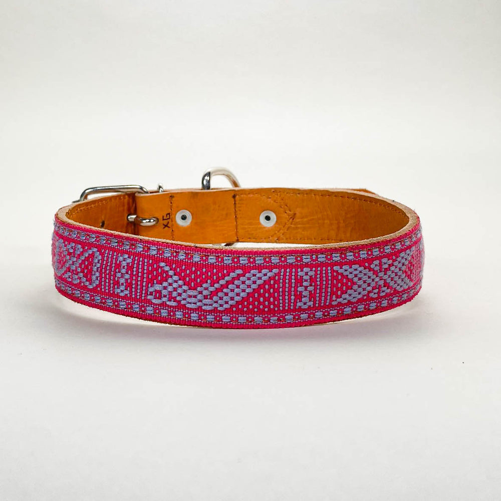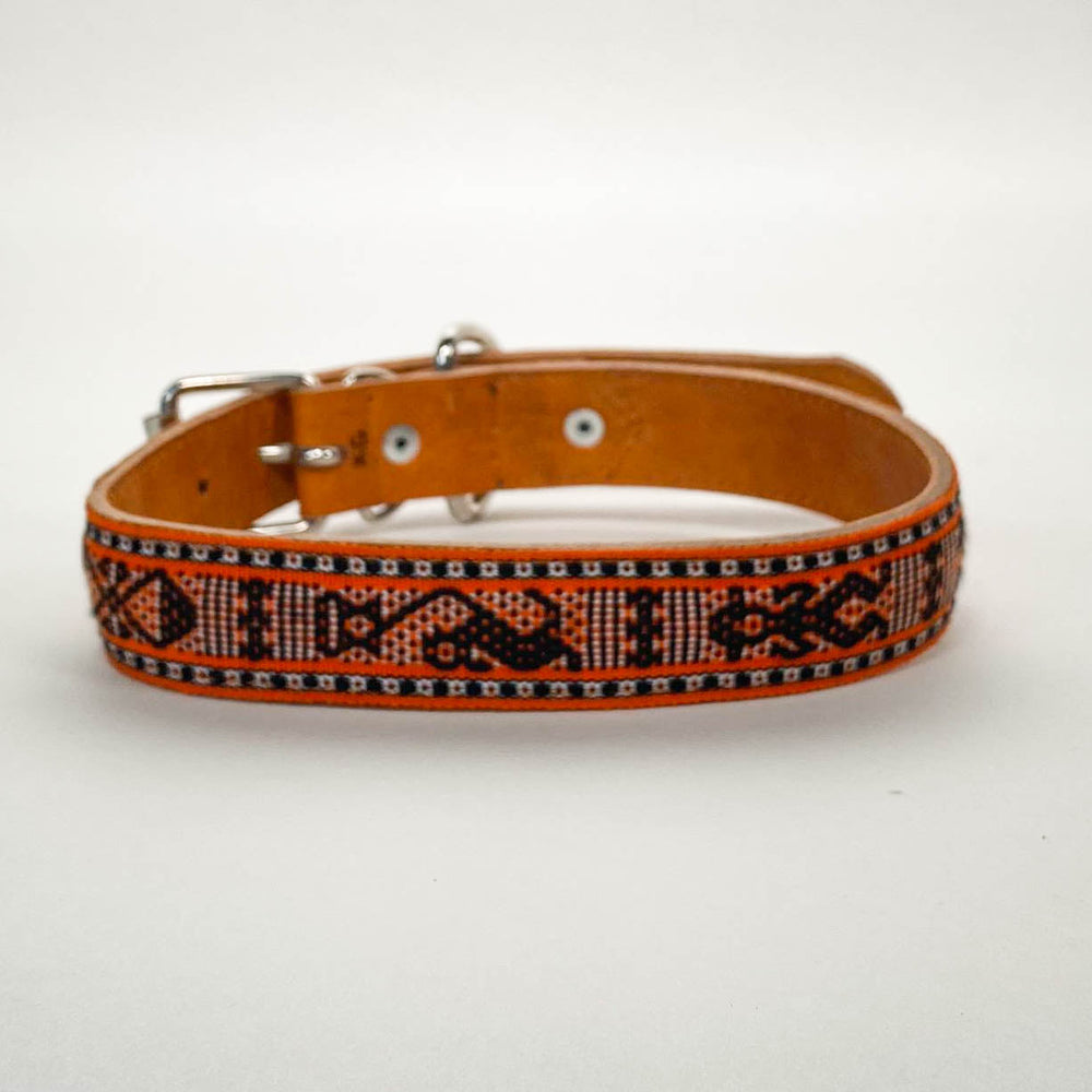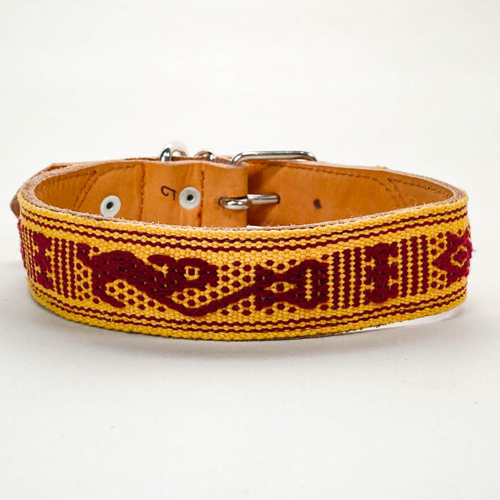 These dog collars and leashes by Ina Chiisi were created in the Valle de Oaxaca, this technique is known as "telar de cintura" and its primary is cotton, which is dyed by natural extracts from plants like nopal, flowers, aloe vera; insects like the grana cochinilla, and fruits like the banana leaf, that the artisans extract and elaborate.